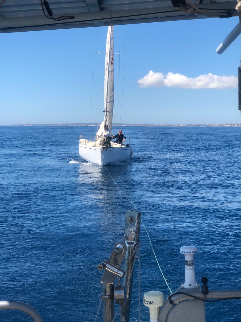Mit Segeln wurde es nichts, da wir nach ca 3 SM eine kleine Segelyacht in Seenot retteten: ohne Wind und mit nicht zu reparierenden Motor trieben sie im Meer.