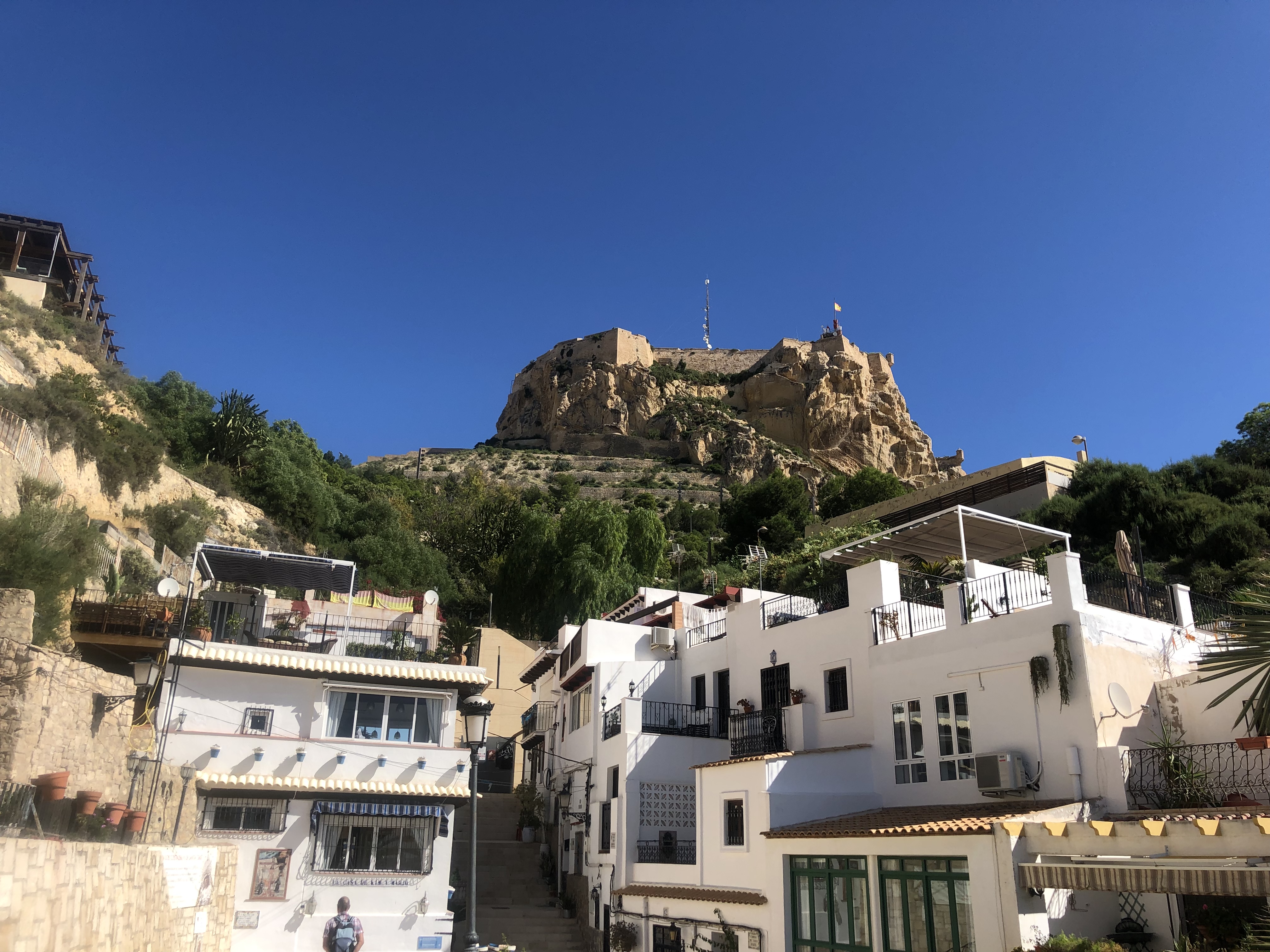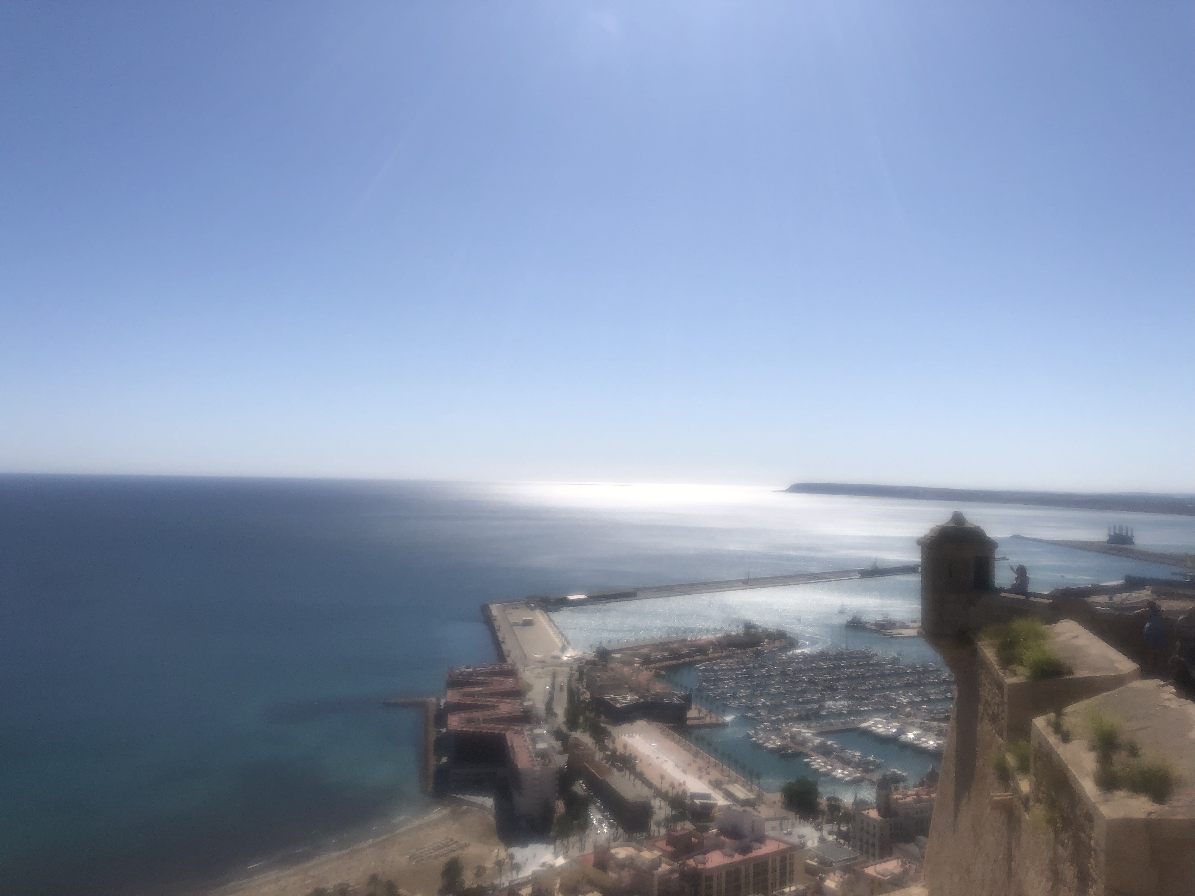 Die Stände erstrecken sich über 2 Etagen, doch wir lassen uns nicht verführen, kaufen nichts sondern trinken in der Sonne hinter der Markthalle einen Cafe con leche. So gestärkt beschließen wir, die Festung Santa Barbara zu erklimmen und zu besichtigen. Hoch über der Stadt thront die ehemalige Burg in gut erhaltenen Zustand. 166 m über dem Meeresspiegel auf dem Berg Monte Benacantil gelegen, unmittelbar am Meer bietet sich uns ein gewaltiger Rundumblick. Bereits die Mauren nutzten im 9. Jhd diesen äußerst strategischen Punkt um die Bucht und das gesamte Hinterland zu verteidigen.