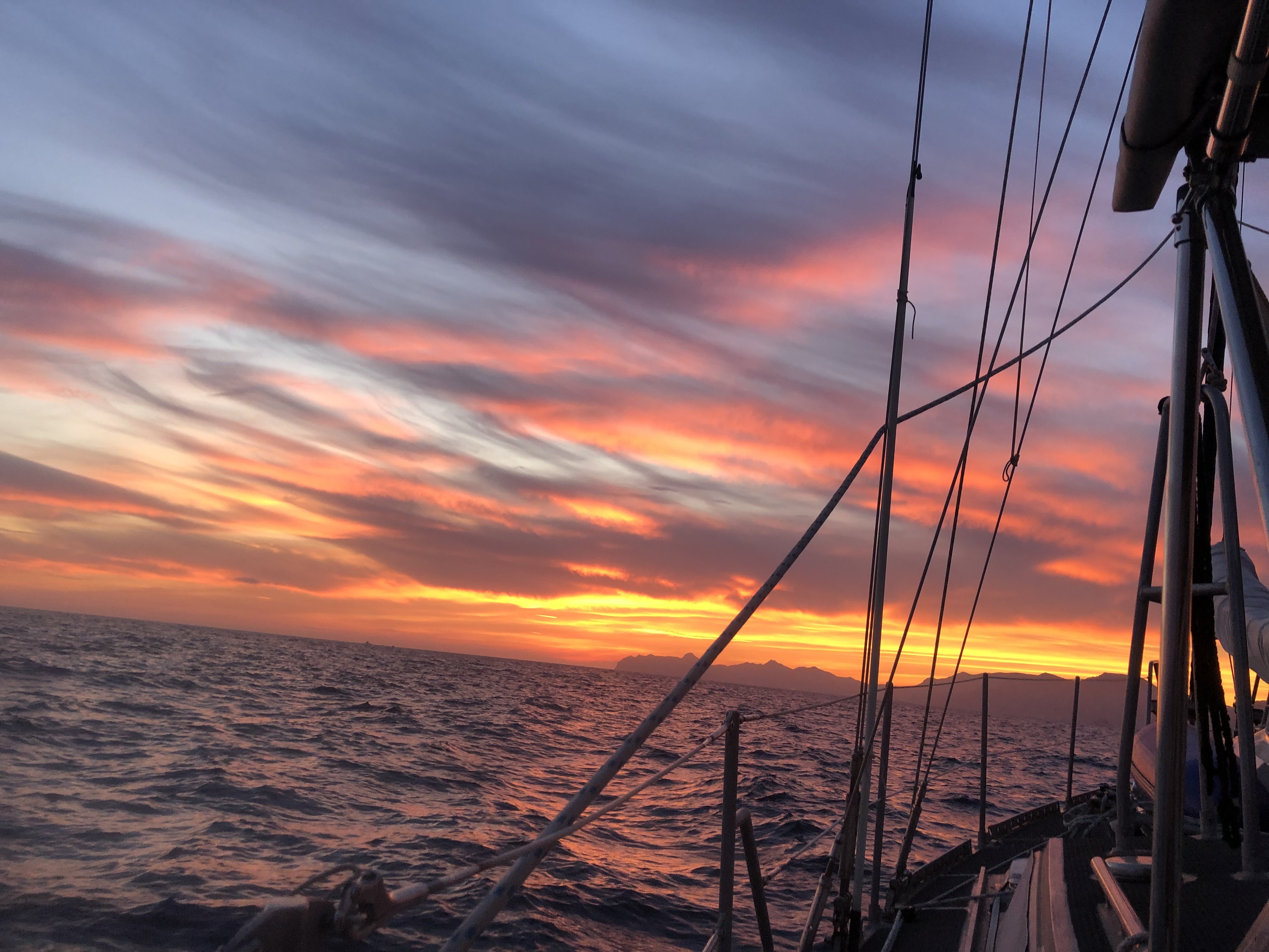 Um 6:45 am 18. Oktober legen wir ab. Mit dem Großsegel versuchen wir Stabilität is Boot zu bringen, aber irgendwie haben wir die Strömung gegen uns. Wir werden immer langsamer, so ein Mist. Aber es sollte noch schlimmer kommen. 2 Mal wird uns heute noch der Motor ausfallen. Und wir wollen doch endlich in Cartagena ankommen. Zum Glück lässt sich die Maschine immer wieder starten, aber, das ist jetzt klar, der Motor braucht nun viel Pflege und Wartung.  Die Delfine merken wohl, dass wir etwas Aufmunterung benötigen. Mehrere Gruppen zeigen, was sie können, springen hoch, überschlagen sich, so dass die Stimmung an Bord steigt. Die Sonne geht in einer Feuerexplossion unter. Mein Gott, unser letzter Sonnenuntergang auf See ist unbeschreiblich schön. So laufen wir im Dunkeln den Hafen von Cartagena an, ein riesiger Naturhafen mit Industrie-, Werften- und Marinebereichen. Auch ein Uboothafen gibt es hier, also viel zu sehen. Unsere Leinen sind um 20:30 fest. Müde trinken wir unser Anlegerbier. Jetzt noch kochen und dann fallen wir müde in den wohlverdienten Schlaf.
