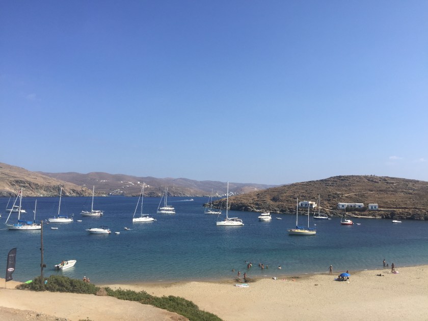 Keine CHANCE das Festland zu erreichen, ablaufen mit dem Sturm. Frank stand im strömenden Regen draußen, während ich versuchte, die Lücken irgendwie dicht zu kriegen. Bis auf die Badluke war alles geschlossen und im Bad selbst war es echt nass. Wir hatten unsere Navigationslichter an, was man von uns entgegenkommenden Motorbootfahrern nicht behaupten kann. Plötzlich war einer direkt neben uns, dank der blitzschnellen Reaktion von Frank ist nichts passiert. Diese Aktion hat unsere Stimmung den Mobofahrern gegenüber nicht gerade verbessert. Am Abend erreichten wir unsere erste Kykladeninsel Kea. Leider stand die ganze Nacht Schwell in die Bucht, das Geschaukel war entsprechend heftig. So sind wir am nächsten Morgen Ankerauf gegangen und direkt zur nächsten Insel weitergesegelt. Frank hatte sich bereits schlau gemacht , wo es hingehen sollte und dann hatten wir auch noch den Tipp von Joe the Sailor, so liefen wir auf Kythnos die Sandy Beach an. Eine traumhafte Bucht mit karibischem Flair, machte die Mühen des Tags zuvor und der verschaukelten Nacht wett.